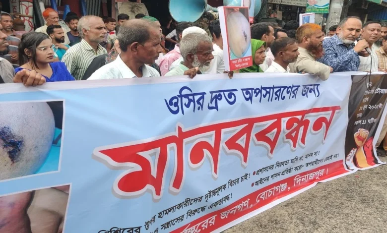 ১৬ জুন সোমবার সকাল ১১টায় উক্ত মানববন্ধনে বক্তব্য রাখেন সন্ত্রাসী ঘটনায় গুরতর আহত শাহরিয়ার শিশির এর পিতা সাবেক কাউন্সিলর মোঃ আসাদুজ্জামান আসাদ, জেলা বিএনপির সহ-সভাপতি ও সেতাবগঞ্জ পৌর বিএনপির সভাপতি নওশাদ আলী, জেলা বিএনপির যুগ্ন সম্পাদক মোঃ মোজাহারুল ইসরাম, সাবেক উপজেলা ভাইস চেয়ারম্যান মোঃ রেদওয়ানুল কারীম রাবিদ, পৌর বিএনপির উপদেষ্টা এমওয়ালী ফ্লাড, উপজেলা ছাত্রদলের আহবয়াক রিয়াদ হাসান চৌধুরী, এমরুল রেজা, মাসুদ খাঁন, রাজশাহী বিশ্ববিদ্যালয়ের ছাত্রী প্রিতী আক্তার নিশি, সাবেক কাউন্সিলর মোঃ মামুন প্রমুখ। বক্তারা বলেন, বোচাগঞ্জের মাটিতে একের পর এক সন্ত্রসী ঘটনা ঘটছে কি বোচাগঞ্জ থানার ওসি মোঃ হাসান জাহিদ সরকার সেই সন্ত্রসীদের বিরুদ্ধে মামলা গ্রহন করছেন না। কারন ঐ সন্ত্রাসীরা হলেন তথাকথিত সমন্বয়ক ফয়সাল মোস্তাকের ক্যাডার বাহিনী। তিনি মামলার বাদীকে চিহ্নিত সন্ত্রাসীর নাম বাদ দিয়ে মামলা করতে বাধ্য করেন। তার পরও এজাহার ভুক্ত আসামীদের গ্রেফতার করছে না। বক্তারা আরো বলেন, বোচাগঞ্জের মাটিতে আর কোন সন্ত্রাসী বা ঘুষ খোর ওসিকে জায়গা দেওয়া হবে না। তারা অবিলম্বে ঘুষখোর ওসি হাসান জাহিদের অপসারন ও কিশোর গ্যাংয়ের সকল সদস্যদের গ্রেফতার আইনের আওতায় আনার জোর দাবী জানিয়ে বোচাগঞ্জ উপজেলা নির্বাহী অফিসার মোঃ মারুফ হাসানের নিকট স্মারক লিপি পেশ করেন।
